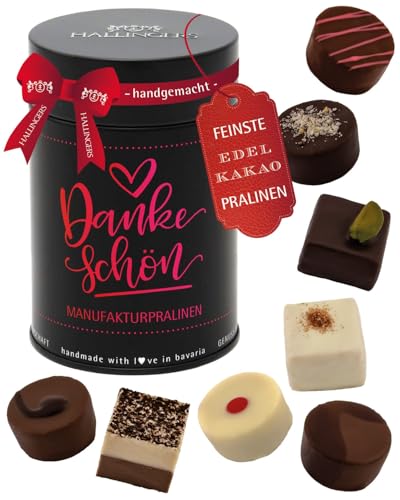 Hallingers Genuss Manufaktur Pralinen Geschenk Danke – ohne Alkohol, handgemacht aus Premium Edelkakao, edle Geschenkdose "Dankeschön", feine Confiserie-QualitĂ€t, Geschenkidee fĂŒr Frauen, zum Bedanken